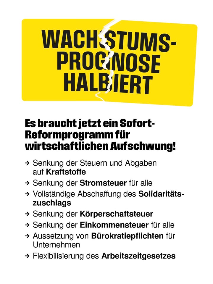Es sind erschreckende Zahlen, die uns heute mit der Konjunkturprognose vorgestellt wurden: Nur noch 0,6% statt 1,3% Wachstum. Die Zeit der bloßen Reform-Ankündigungen der Regierung Merz muss nun enden. Es braucht jetzt ein Sofort-Reformprogramm für unser Land.